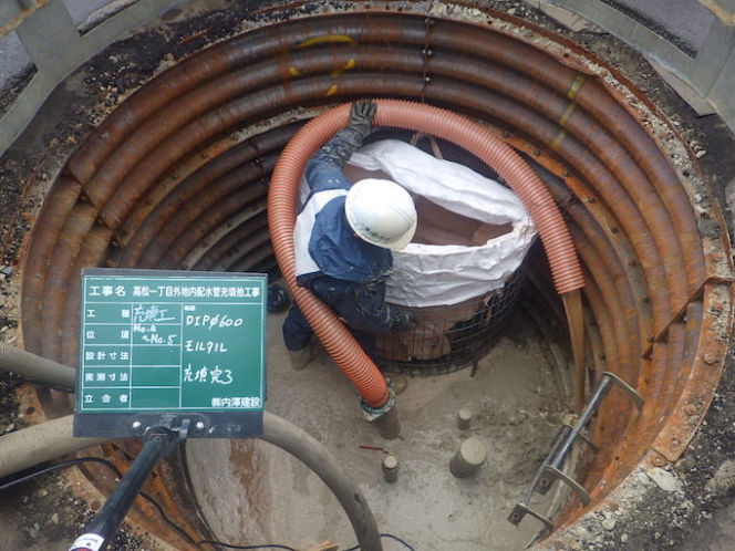 滝沢市砂込地域の下水道普及のために行った下水道幹線工事です。泥土圧推進工法(φ300/レジンコンクリート管)工法による推進工事を行いました。施工延長 L=195.9m