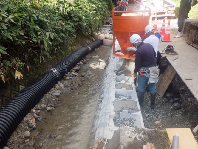 老朽化した水道管(φ250~600 L=1507.8m、充填量 349㎥)の充填工事を行いました。